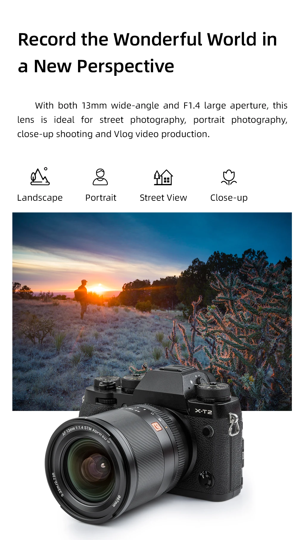 С широким углом обзора 13 мм и большой диафрагмой F1.4, этот объектив идеально подходит для уличной фотографии, портретной фотографии, съемки крупным планом и видеопродукции Vlog.