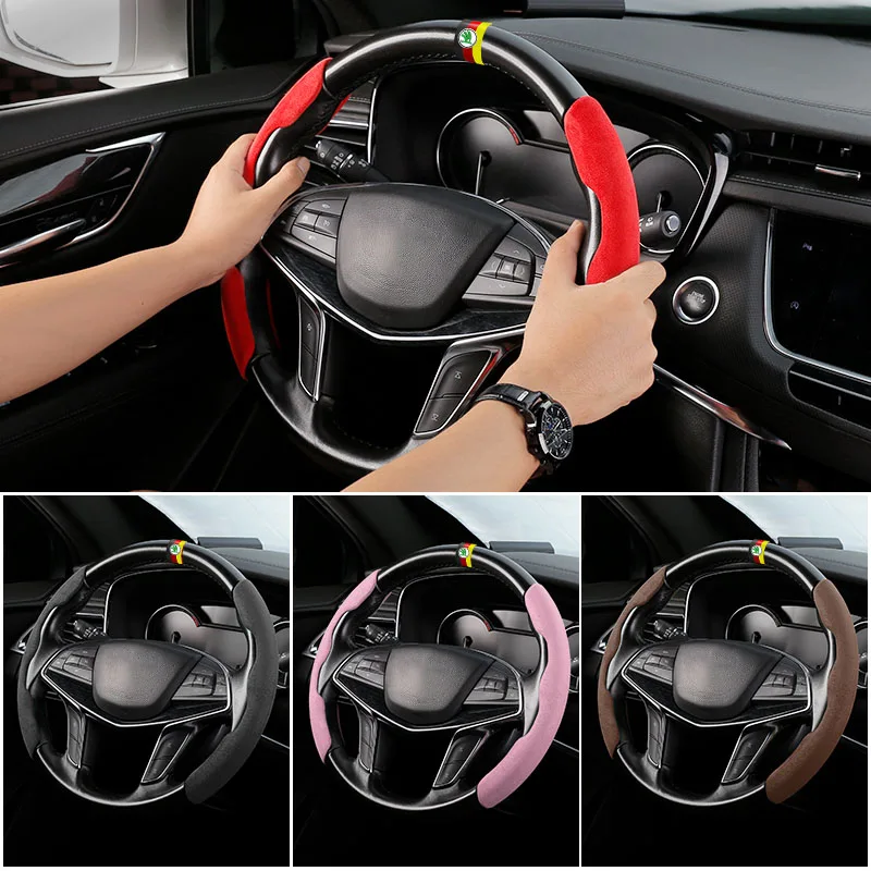 2 шт., автомобильные аксессуары для логотипа, замшевое Автомобильное рулевое колесо, защитный чехол, впитывающий пот, нескользящий возврат, положительный стикер для интерьера Skoda Octavia Fabia Superb Rapid Scala Kamiq Karoq производные Vrs Mk3 A4 A6 A7 2 3 A5 kodiq