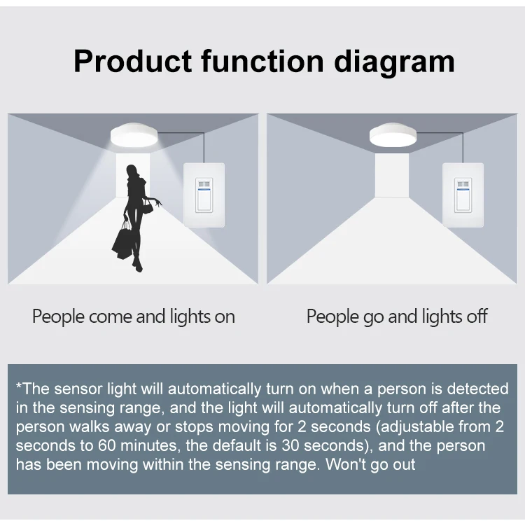 * Универсальная Настройка: светильник датчик переключателя имеет регулируемые настройки. Автоматическое включение/выключение и ручное включение/автоматическое выключение, Регулируемая задержка времени от 15sec-1min-5mins-15mins-