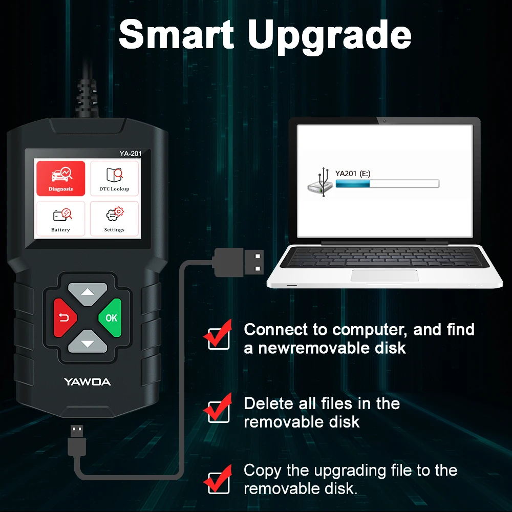 YA201-диагностический сканер, работающий на основе установленных OBD-II протоколов: