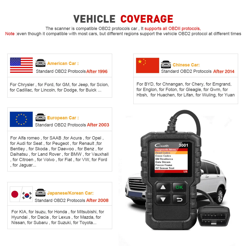 1. Несмотря на то, что он совместим с большинством автомобилей, но различные регионы поддерживают протокол OBD2 транспортного средства в разное время, или некоторые машины имеют специальный дизайн, поэтому он может не совместим с некоторыми автомобилями, которые не поддерживают протокол OBD2. Особенно японский и корейский автомобильный бренд.