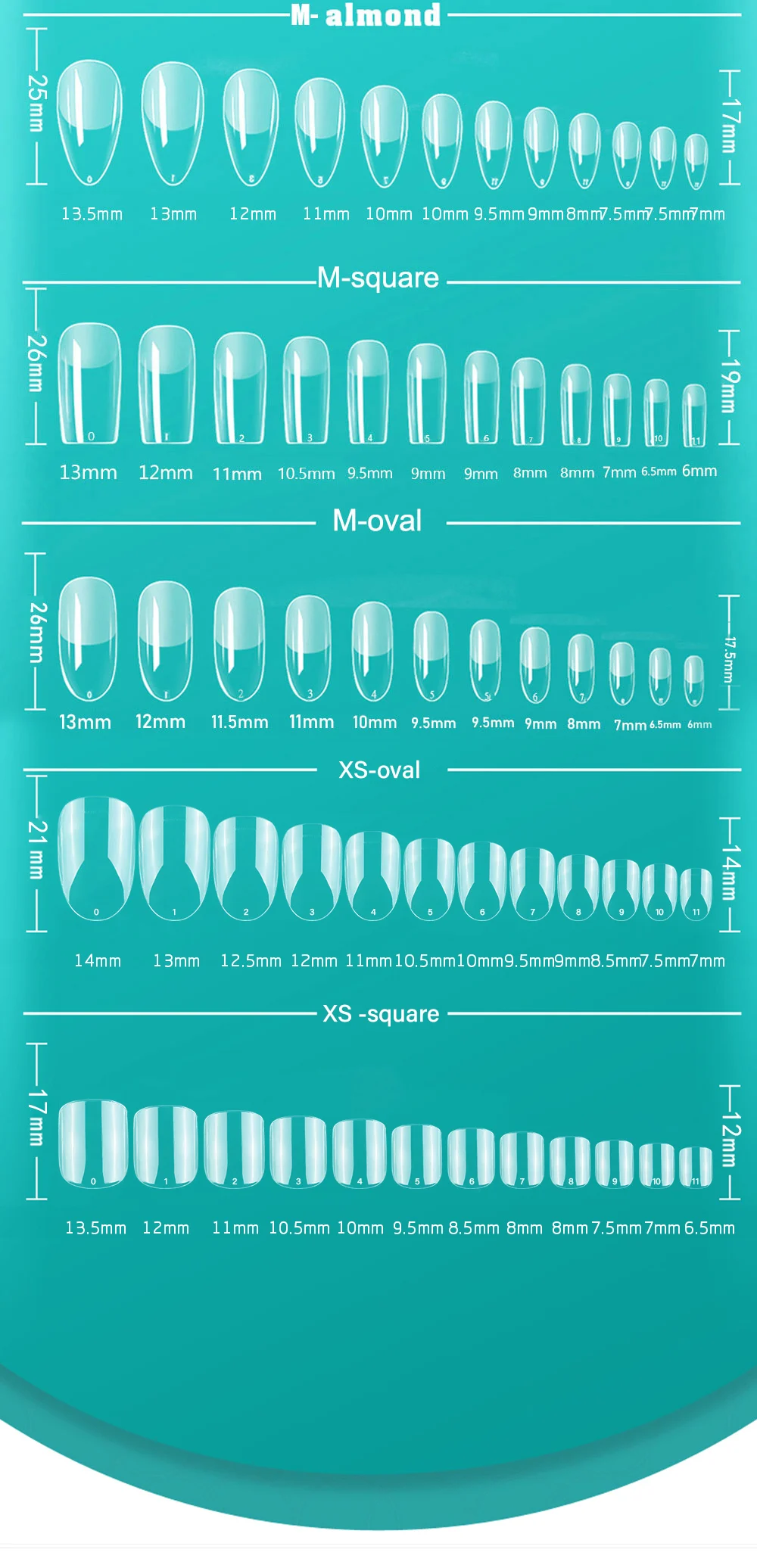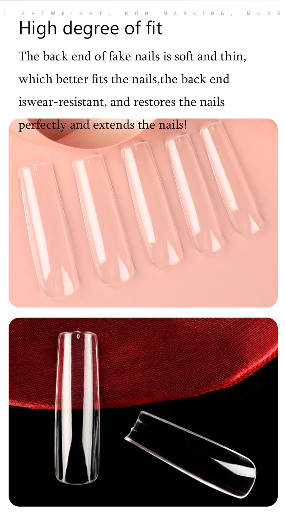 The back end of fake nails is soft and thin,which better fits the nails,the back end iswear-resistant, and restores the nails