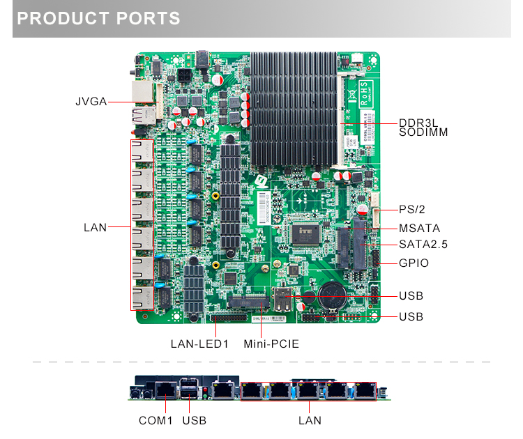 1 | D19SL VER: 1,1 | J1900 | 2,0 ГГц | 1 * SODDR3L | 1 | X | 6 * WGI211AT | 6 | 2 | X | DC12V |