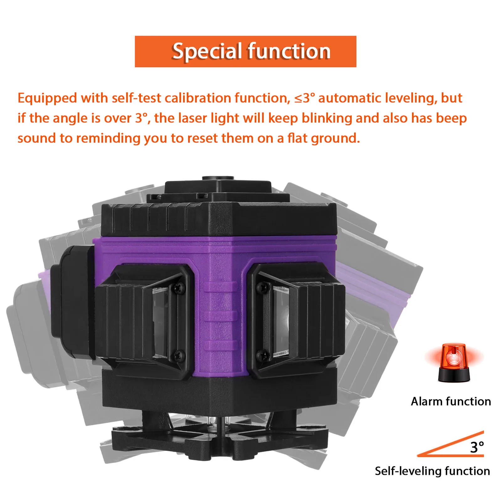 Оснащен функцией самостоятельной калибровки, ≤ 3 ° автоматическое выравнивание, но если угол превышает 3 °, лазерный светильник будет продолжать мигать, а также имеет звуковой сигнал, чтобы напомнить вам, чтобы сбросить их на ровную поверхность.