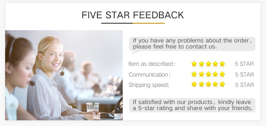 1. Ваше подтверждение будет высоко оценено после получения товаров. Как только вы получили товар, надеемся, что вы оставите нам положительный отзывы (4 или 5 звезд).