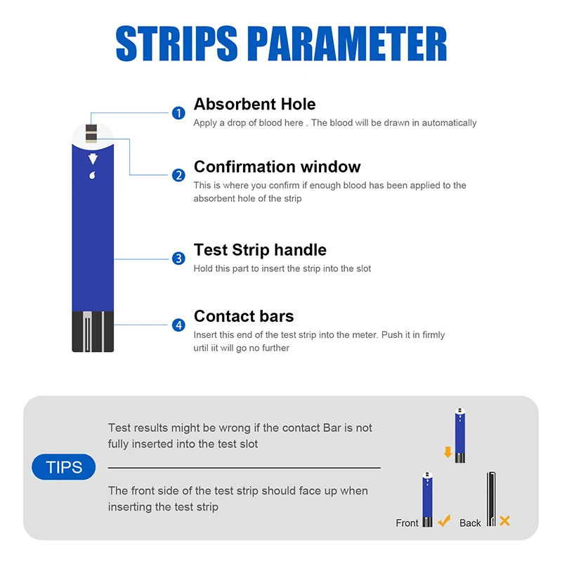 3. Принцип тестирования: тест основан на измерении электрического тока, вызванном реакцией глюкозы с реагентом полосы. Измеритель измеряет ток и отображает уровень глюкозы в крови.