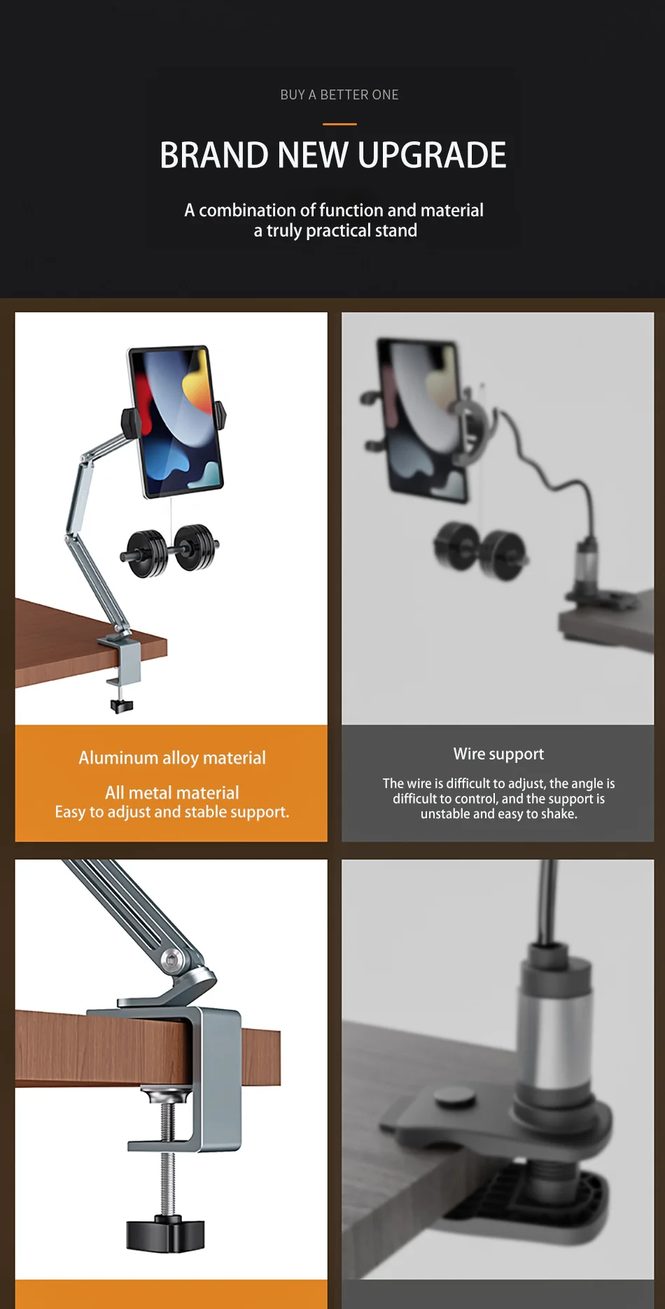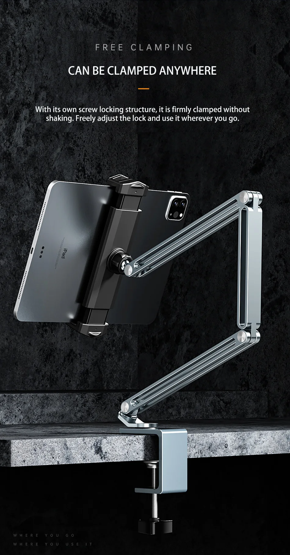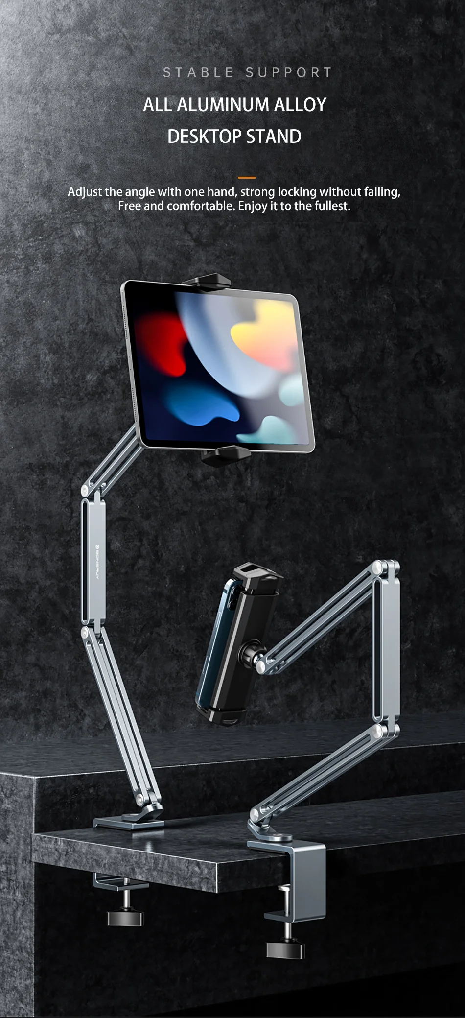 Характеристики: вращающийся на 360 градусов зажим, складная длинная рука, регулируемый шарнир, тяжелое основание