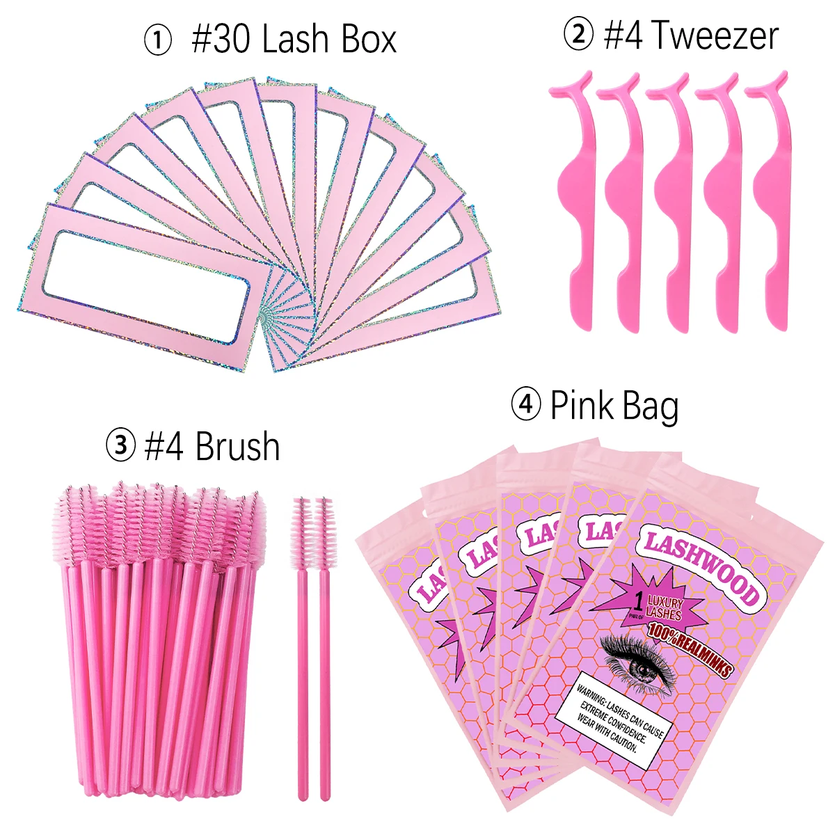 30 комплектов = 30 коробок + 30 пинцетов + 30 кистей + 30 мешков с логотипом