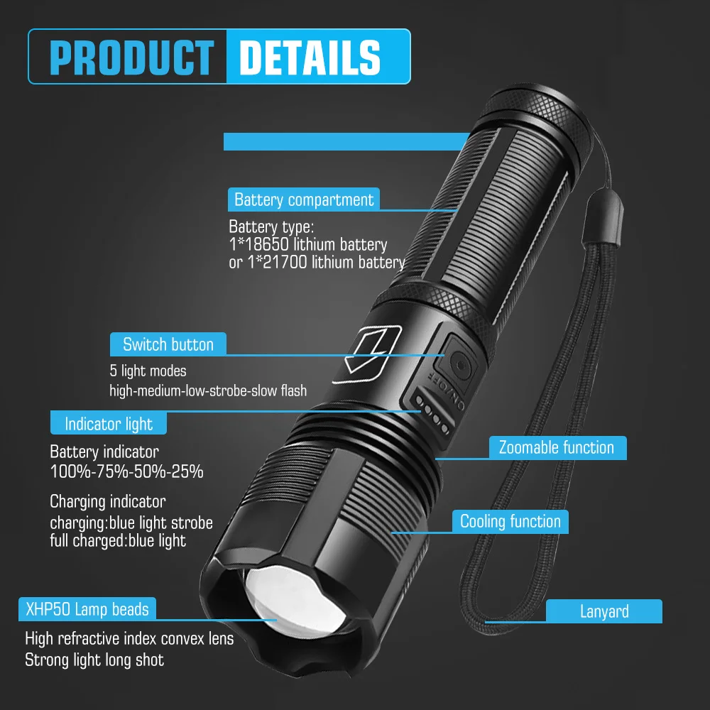 Тип батареи: 1*18650 литиевая батарея или 1*21700 литиевая батарея или 3 * AAA батарея