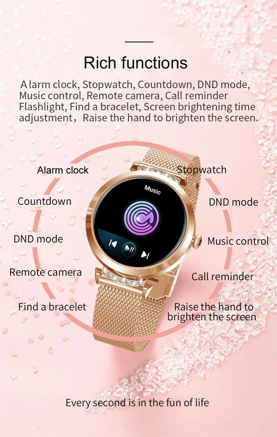 Стандартные спортивные функции (ходьба/бег/Альпинизм/Велоспорт/Баскетбол/плавание/Бадминтон/Футбол/эллиптическая машина/Йога/настольный теннис/скакалка/теннис/Бейсбол/регби/обруч хула/гольф/длинный прыжок/сидения/Волейбол.), мониторинг сна (время сна, качество сна) уведомления о звонках, напоминания о информации, многоязычное нажатие, напоминание о будильнике, напоминание о задаче (напоминание о сидячем положении), синхронизация данных с APK/APP.