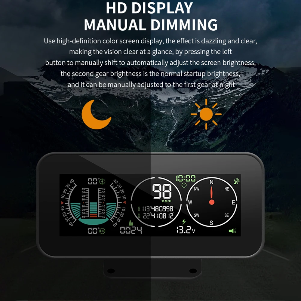 Измерение угла прокатки и угла наклона транспортного средства в режиме реального времени. Точно отображает значение наклонения вниз/в гору и влево/вправо и оснащен сигналом о наклоне.