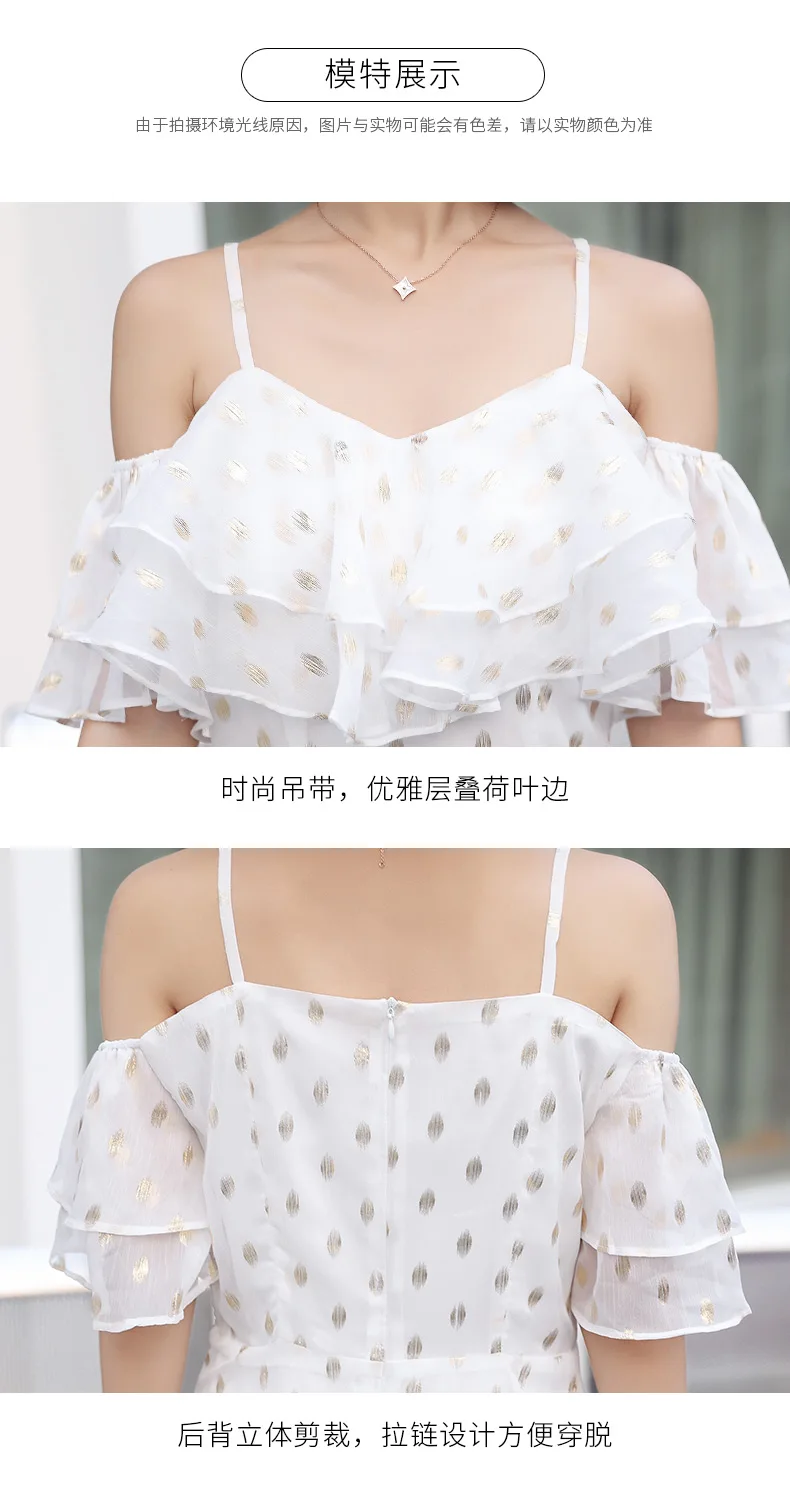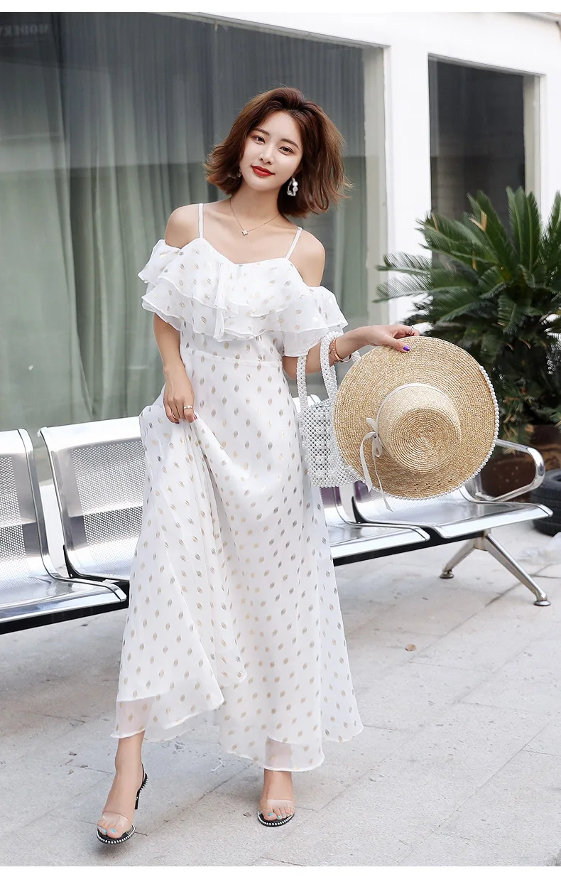 2020 летнее женское платье белое элегантное Бохо богиня слинг росы плечи оборки волнистые точки шифоновое длинное платье DV823