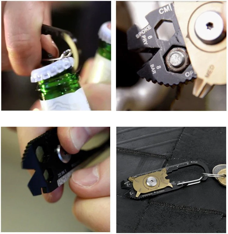 Особенности: 5 В Натуральную Величину ключ, дюймовый стандарт, 3 размера односимвольным отвертка, 2 размера, инструменты для рыбалки гвоздодер, провод для зачистки, маникюр, нож для чистки, ногтей, тереть нож, sharp нож для резки, измерительный инструмент, велосипедный ключ, открывалка для бутылок, зубчатый резак и эластичная Пряжка для ключей характеристики: Размеры: длина 85 × ширина 25 мм Материал: 422 ранг нержавеющая сталь, K5 стальное лезвие