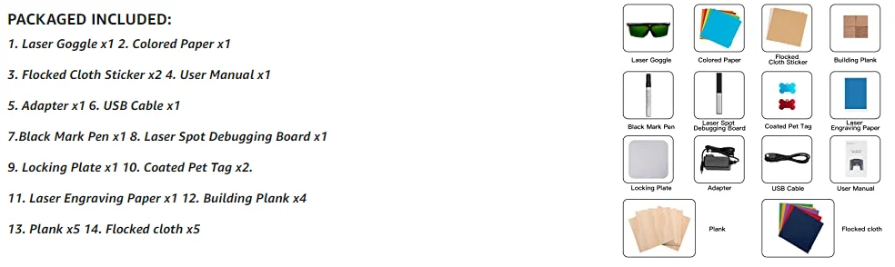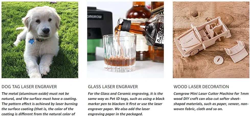 Инструмент для лазерного гравера Comgrow Mini может гравировать на деревянном блоке, цветной бумаге, бамбуковой доске, фланели, коже, PLA, глиноземных бирках для домашних животных и других материалах. И этот небольшой лазерный гравер также может гравировать на стекле и керамике с помощью цветной бумаги с гравировкой (входит в комплект). Материалы, которые нельзя гравировать: все материалы, которые нельзя сжигать, такие как металл (без лакокрасочного покрытия), огнестойкие материалы, прозрачные пластмассы, зеркальные предметы и объекты с высокой отражающей способностью.