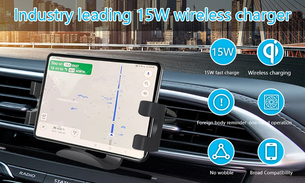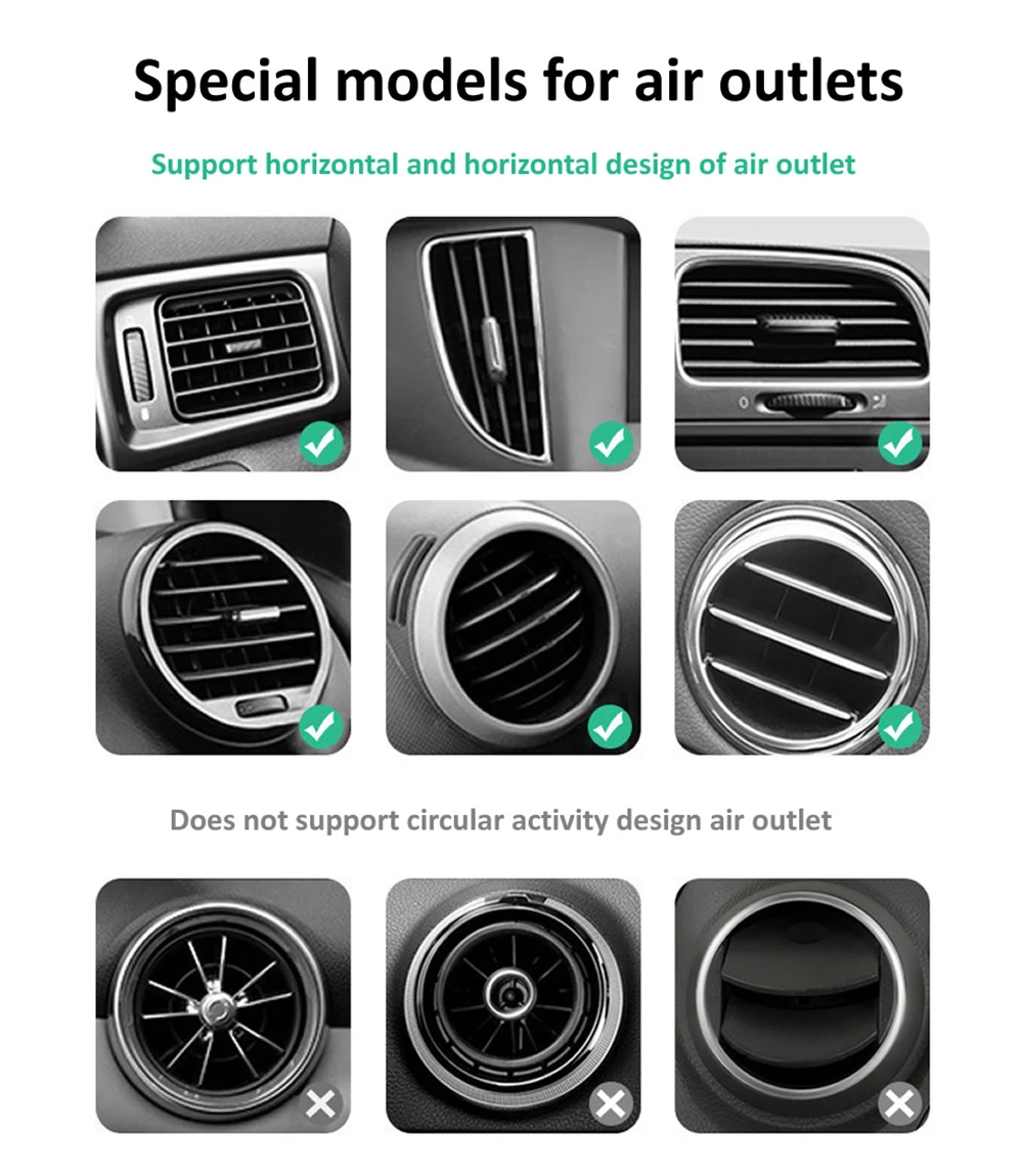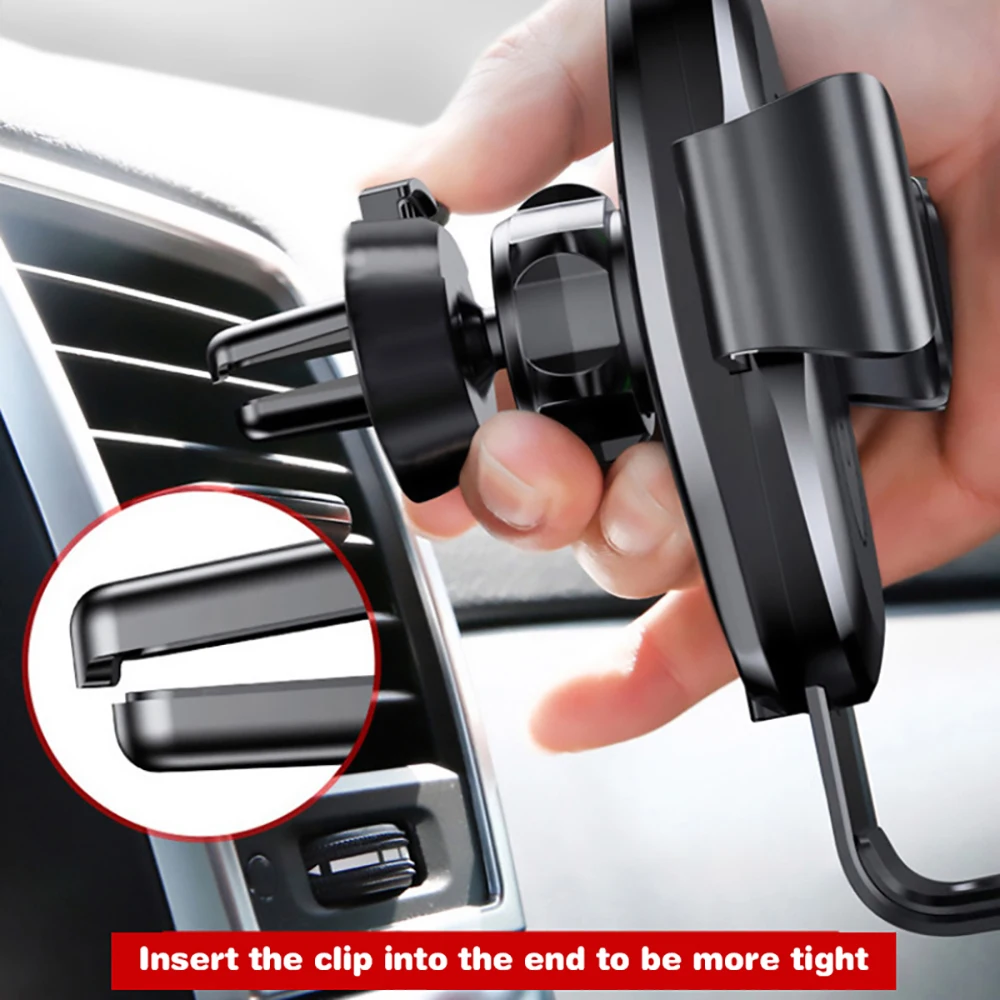 > Беспроводное автомобильное зарядное устройство: беспроводное автомобильное зарядное устройство Qi сочетает держатель телефона на вентиляции и беспроводное автомобильное зарядное устройство в одном. Это Qi Беспроводное зарядное устройство для телефона со встроенным интеллектуальным чипом может защитить ваш телефон от перезаряда, перегрузки по току, короткого замыкания, высокой температуры и т. д.