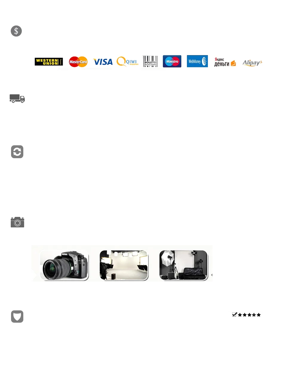 В дальнейшем будут доступны другие варианты оплаты на Aliexpress.ОплатаАли наши товары будут отправлены по адресу покупателя, который предлагает покупатель, пожалуйста, подтвердите свой адрес перед оплатой.Мы отправим товар в течение 3 рабочих дней после завершения оплаты. (Праздничные дни могут быть продлены)ВозвратМы делаем все возможное, чтобы обслужить наших клиентов по высшему разряду.Мы вернем вам деньги, если вы вернете товар в течение 7 дней с момента получения товара по любой причине. Однако покупатель должен