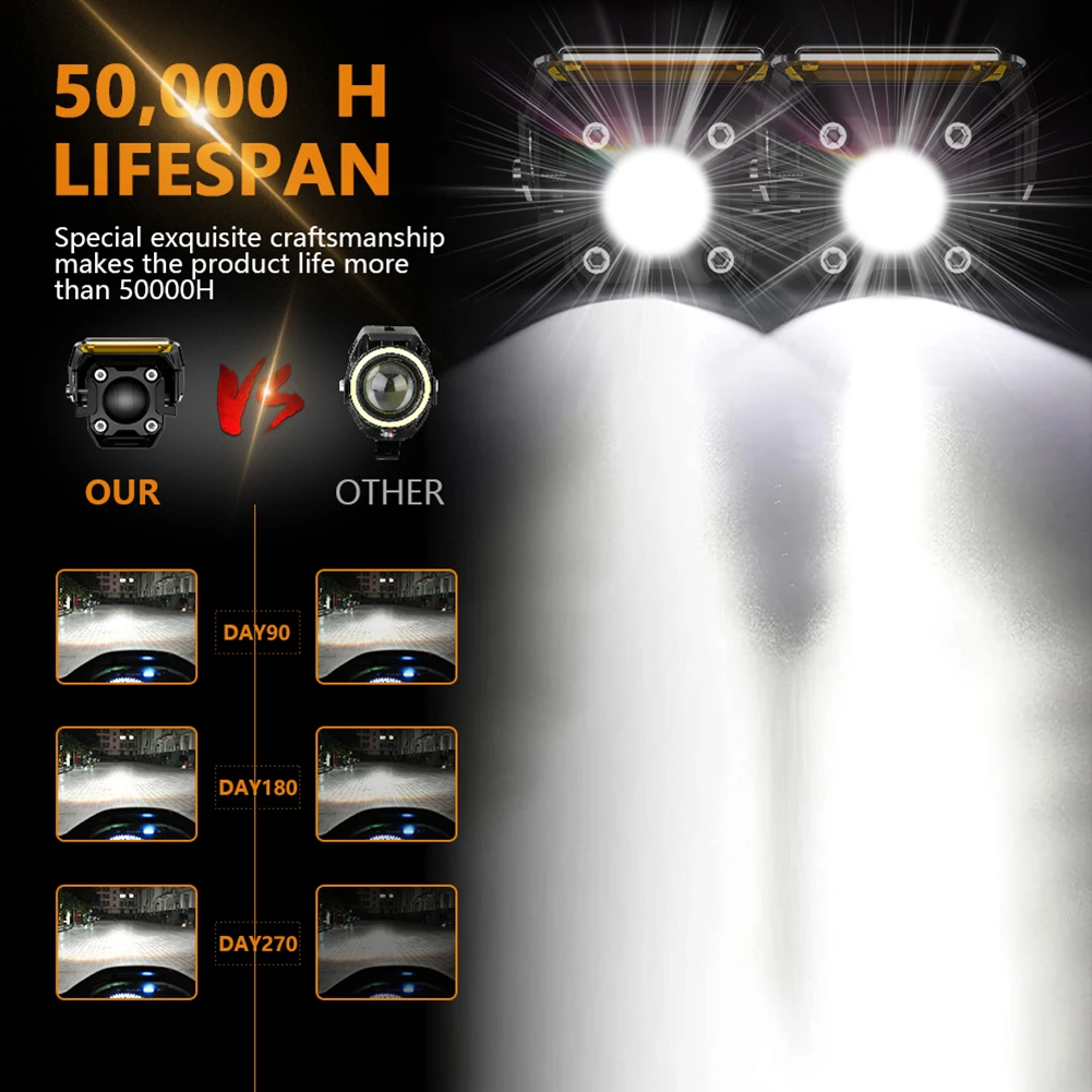 *1. Clearer Road View: Equipped with powerful 15W 6 CREE LED chips, with 6000K White Light (High/Low beam) & 3000K Amber Light(High/Low beam), the spot lights can meet the various needs of driving on rainy and foggy days or normal weather