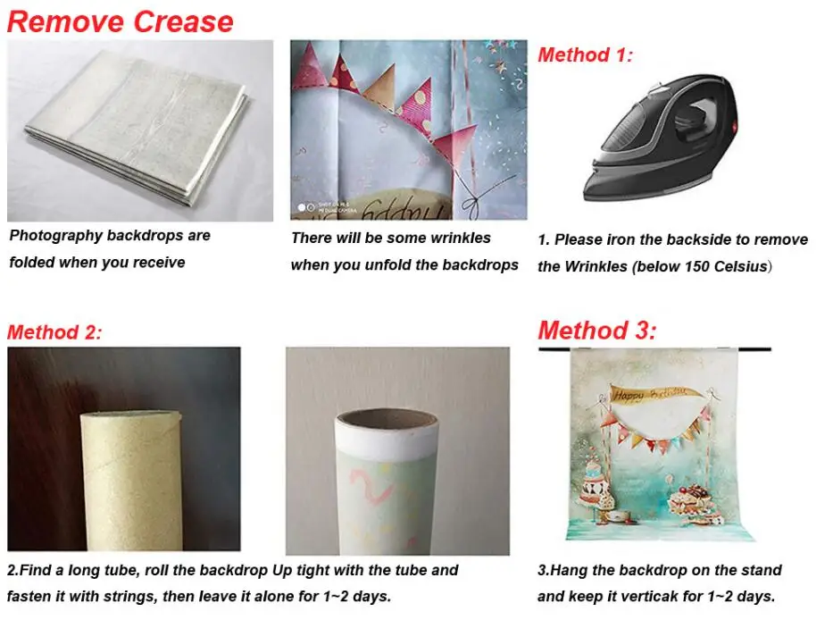 Примечание:В соответствии с правилами почтового отделения Длина изделия не должна превышать 60 см. Товары будут отправлены в сложенном виде. Поэтому могут быть складки. Вы должны справиться с этим самостоятельно. Вот способы решения:1) плотно закатайте его цилиндром в течение 3-4 дней, все будет в порядке.2) Нагрейте его паровым утюгом на задней части изделия, затем он снова будет гладким.3) Просто Повесьте его на подставку для фона в течение 1-2 дней