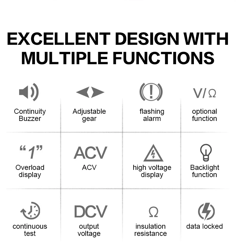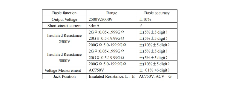 2. Он наиболее подходит для проверки сопротивления изоляции, таких как электрические, кабельные, электрические иМеханическое оборудование, телекоммуникационное оборудование и электрические объекты.3. Технические особенности3,1. Общие особенности(1) Дисплей: 84,8 × 59,8 мм ЖК-дисплей. Максимальный дисплей «1999».(2) индикация диапазона: MSD показывает «1», когда он превышает диапазон.(3) функция будильника: счетчик будет оповещаться автоматически, когда Проверенное сопротивление находится ниже нижнего диапазона, и чтениеНедействителен.(4) Источник питания: #5 батарей LR6 (1,5) × 8.(5) индикация низкого заряда батареи:“”Дисплеи(6) Рабочая среда: температура 0~40℃,30% R.H- 85% R.H(7) Вес: прибл. 630 г (включая батареи)Технический индекс4. Обратите внимание: о беттерии (Удалить)