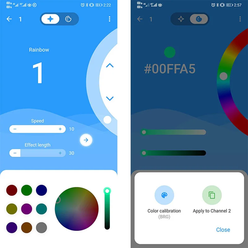 • На странице эффектов представлены различные музыкальные эффекты и немузыкальные эффекты, пользователи могут устанавливать скорость, яркость, цвет, направление и длину эффекта для определенного эффекта.