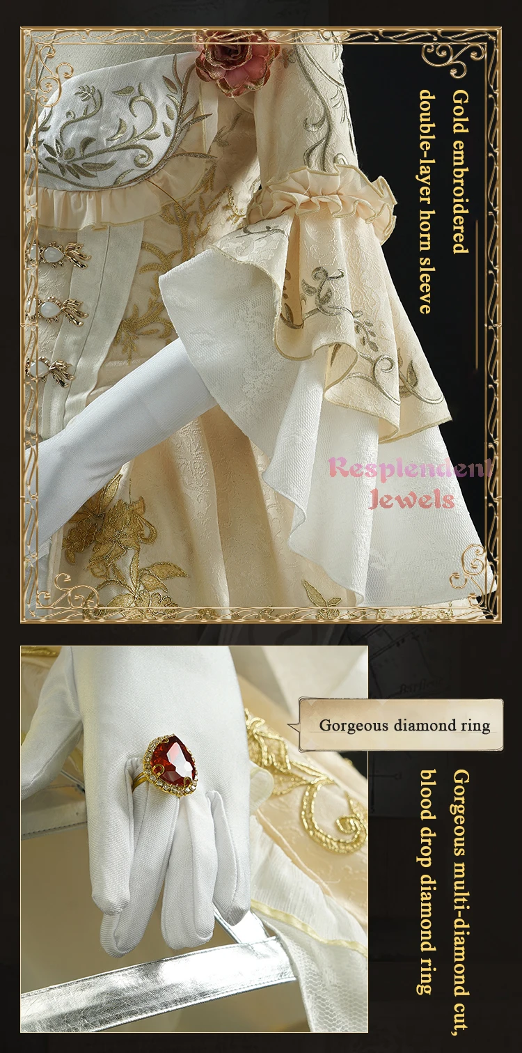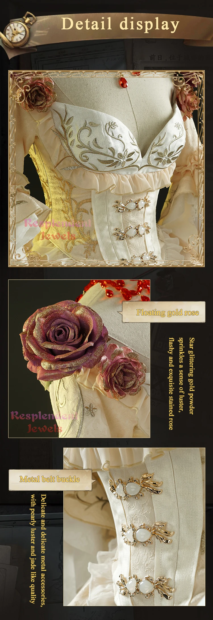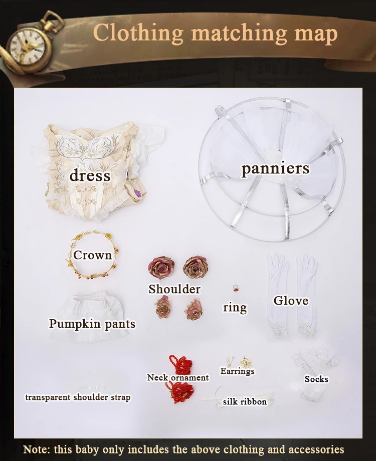 Полный комплект включает: платье * 1 + Поддержка юбки * 1 + брюки с тыквой + корона + украшение на плечо + кольцо + перчатки + прозрачная Наплечная лямка + украшение на шею + серьги + ленты + носки