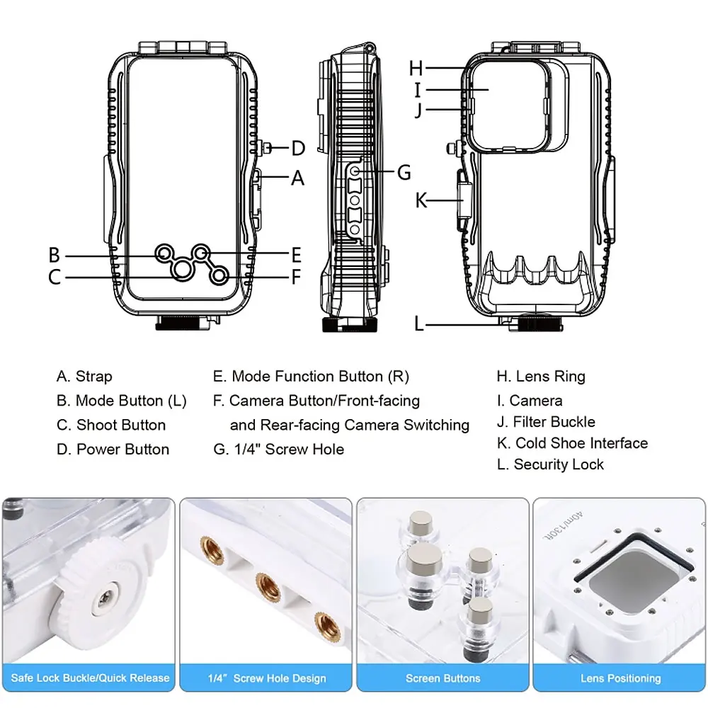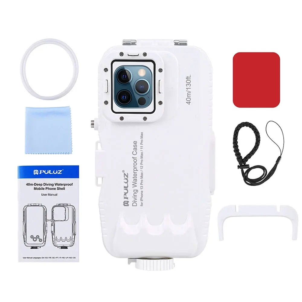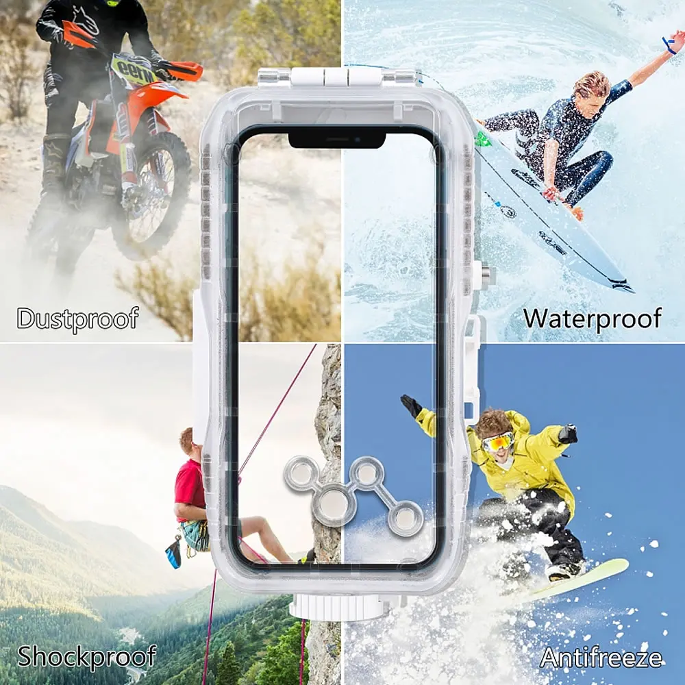 Дайвинг подводное плавание 40 м/130 футов Водонепроницаемый чехол для видеосъемки подводного съемки чехол для iPhone 11 12 13 Pro Max Mini Характеристика: 1. Высококачественное прочное стекло, ПК устойчив к коррозии. 2. Водонепроницаемая глубина 40 м/130 футов, подходит для подводной съемки. 3. Принимает бесшовный и полностью закрытый процесс, защищает от воды, падений, царапин и грязи. 4. Четкое изображение и легко контролировать под водой. 5. Используется для выделенного сотового телефона, вращающегося и трудосберегающего дизайна открывания, проводящего клейкого сенсорного управления, высокой прочности и сопротивления давлению. 6. Идеально подходит для дайвинга, серфинга, Сноркелинга, катания на лыжах, яхты или других видов деятельности. Посылка: 1. Водонепроницаемый чехол x 1 2. Руководство x 1 3. Ремешок x 1 4. Красный фильтр x 1 5. Чистящая ткань x 1 6. Уплотнительное кольцо x 1