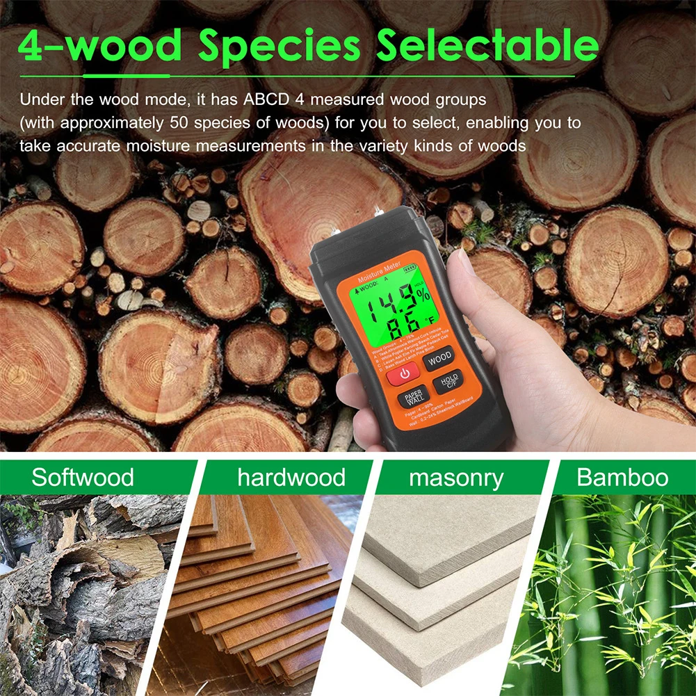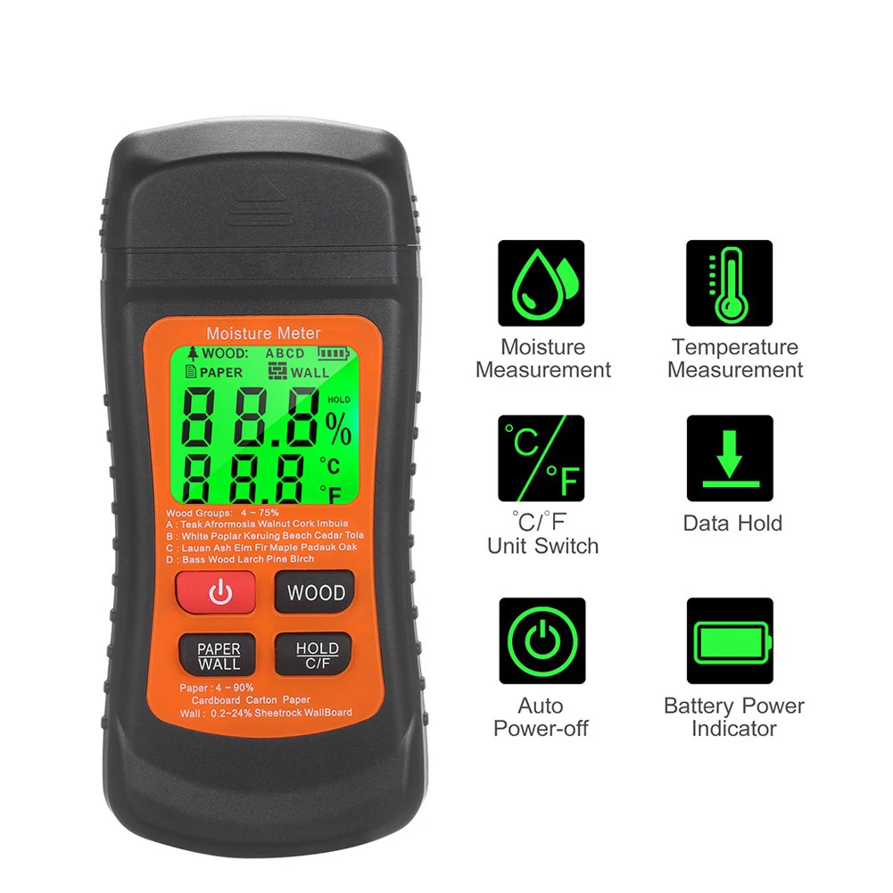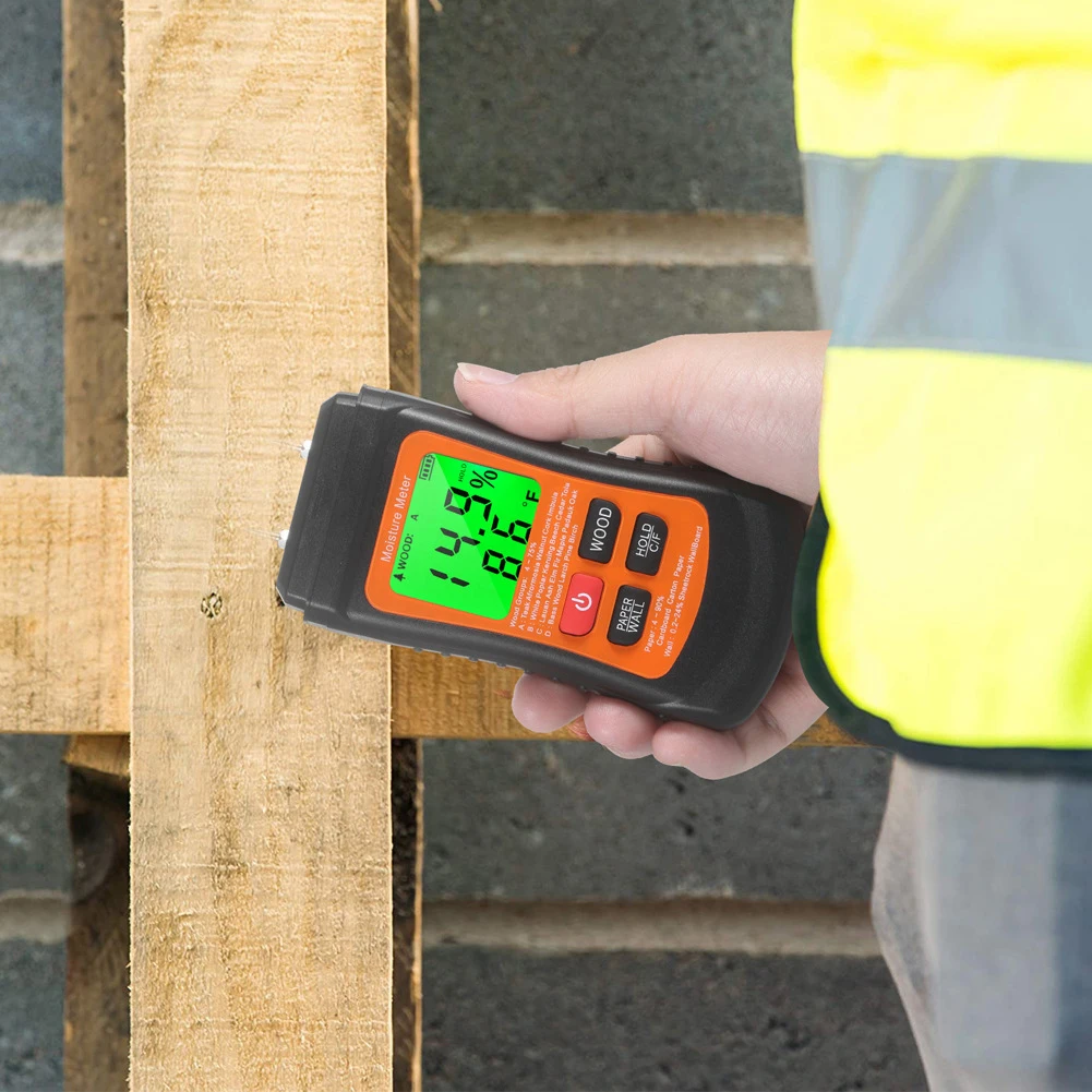 Feature: High strength probe designed to measure the moisture content of most wood, bamboo, walls. The data hold function, which can lock the measurement data, is convenient for checking and recording moisture, and the function is very practical. Three modes: 1. Wood mode: In order to measure the humidity of wood, 4 kinds of wood can be selected. 2. Paper mode: used to measure cardboard, carton, etc. 3. Wall mode: for measuring walls, floors, building materials, etc. Specification: Material: ABS plastic Size: 144*64*31mm Power supply: 2 X AAA batteries (not included) Wood range: 4-75% Paper range: 4-90% Wall range: 0.2-24% Resolution: 0.1% Accuracy: ±0.5% Automatic shutdown: after 5 minutes Note: Due to the different monitor and light effect, the actual color of the item might be slightly different from the color showed on the pictures. Thank you! Please allow 1-2cm measuring deviation due to manual measurement.