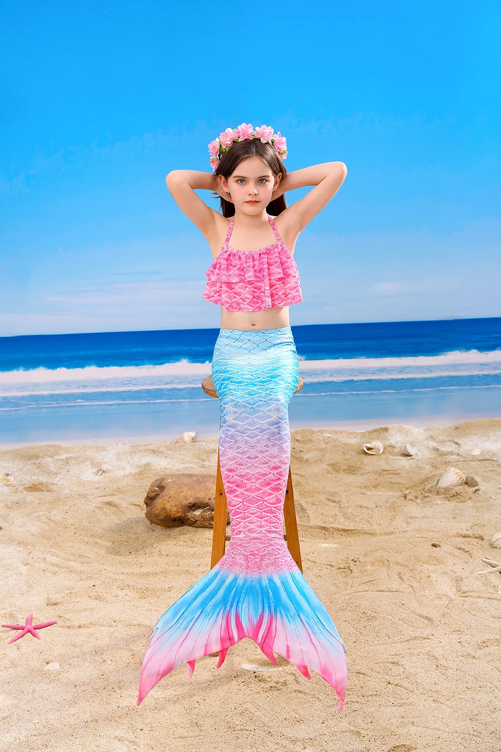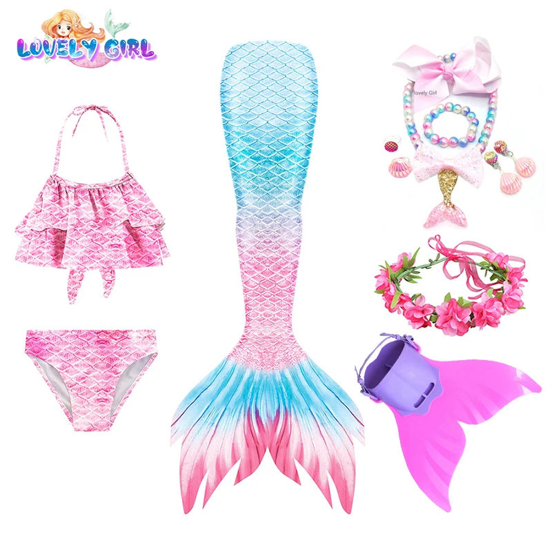 4 шт.: 1 юбка с хвостом русалки + 1 бюстгальтер + 1 шорты + 1 венок