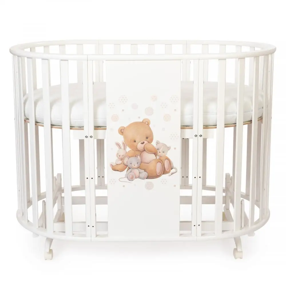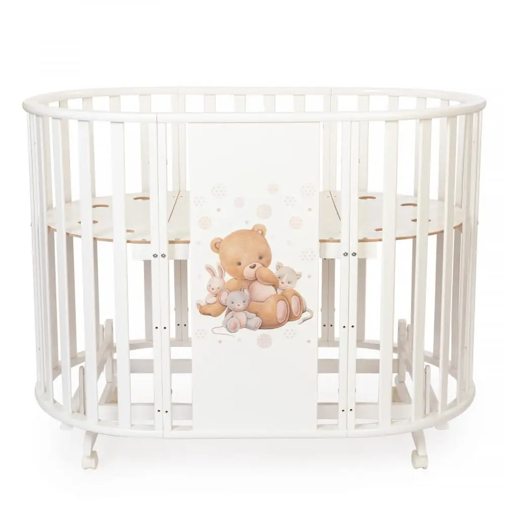 Кроватка-трансформер Vikalex овальная Мишкина Компания с маятником для детей от рождения до пяти лет. Изготовлена из массива берёзы из экологически чистых районов России. Кроватка трансформируется в круглую с пеленальным столиком, овальную, манеж, диванчик, стол со стульями. Родителям будет удобно использование одновременно маятника для укачивания малыша и наличие колёс для перемещения по комнате. Сняв переднюю стенку, кроватка меняет внешний вид и больше напоминает диванчик. Дно с вентиляцией, создаёт комфортные условия для сна. Все материалы абсолютно безопасны для малышей.