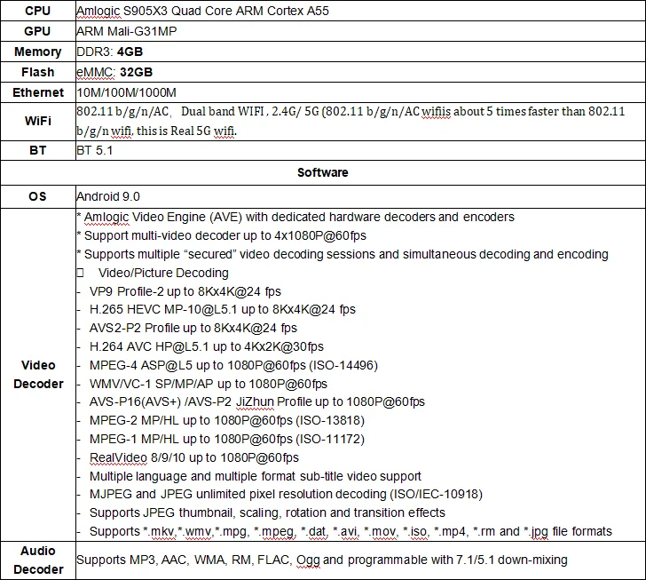 -ЦП:Amlogic S905X3Четырехъядерный ARM Cortex A55;