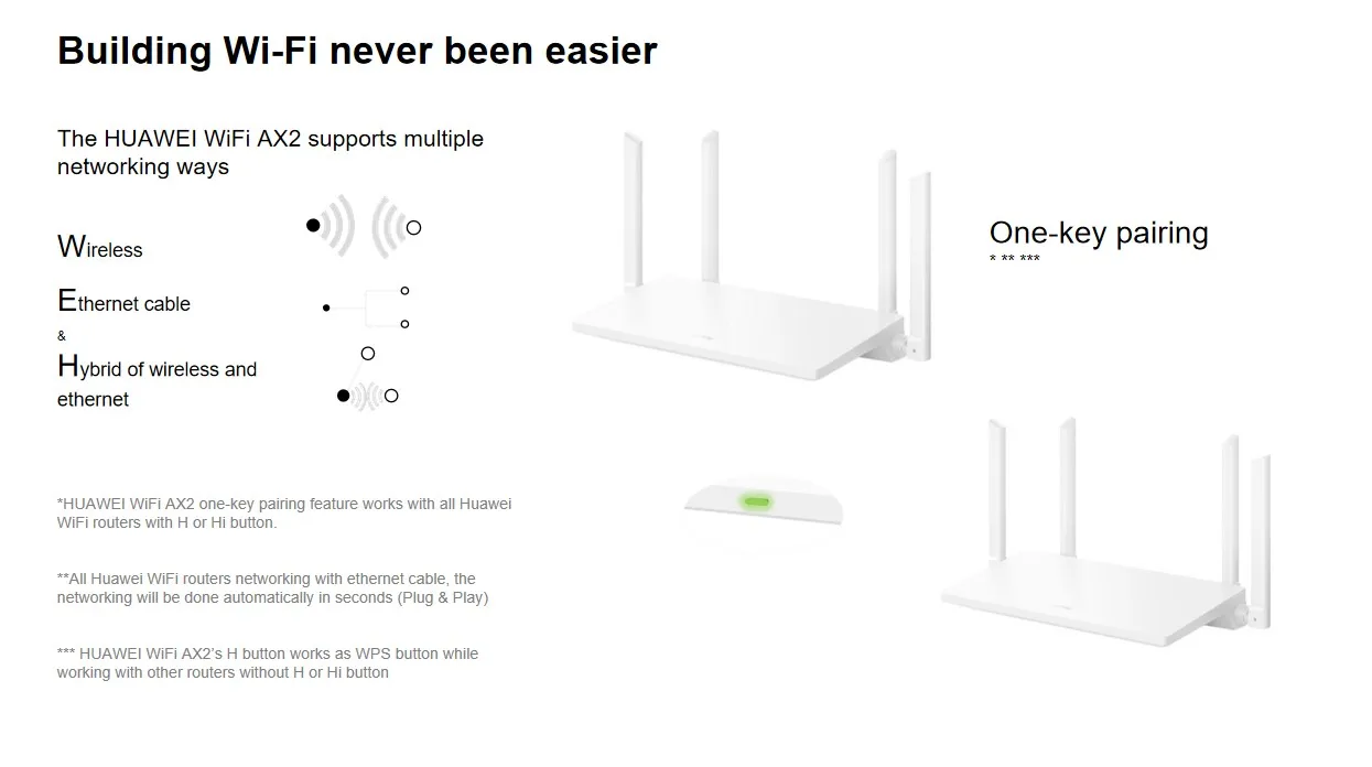 * Функция сопряжения с одним ключом HUAWEI WiFi AX2 работает со всеми маршрутизаторами Huawei WiFi с кнопкой H или Hi.