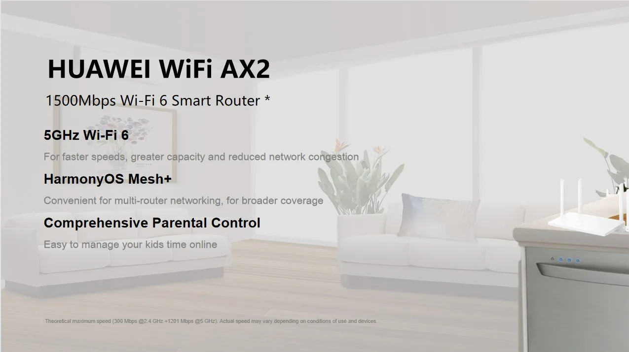 * HUAWEI Wi-Fi AX2 поставляется с Wi-Fi 5 ГГц и 2,4 ГГц полосы, которые работают одновременно. Ваши устройства будет автоматически переключаться между Wi-Fi 5 ГГц и 2,4 ГГц полосы для оптимального использования.