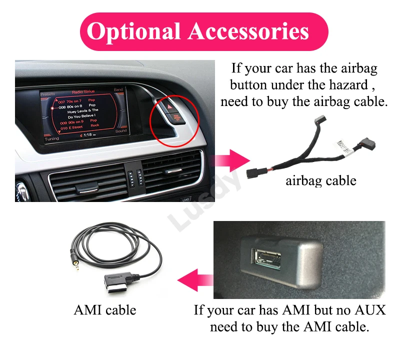 Если у вашего автомобиля есть кнопка подушки безопасности, или он имеет AMI, но нет AUX, вам понадобится дополнительная подушка безопасности и кабель AMI, пожалуйста, свяжитесь с нами, чтобы купить его до или после вашего заказа.
