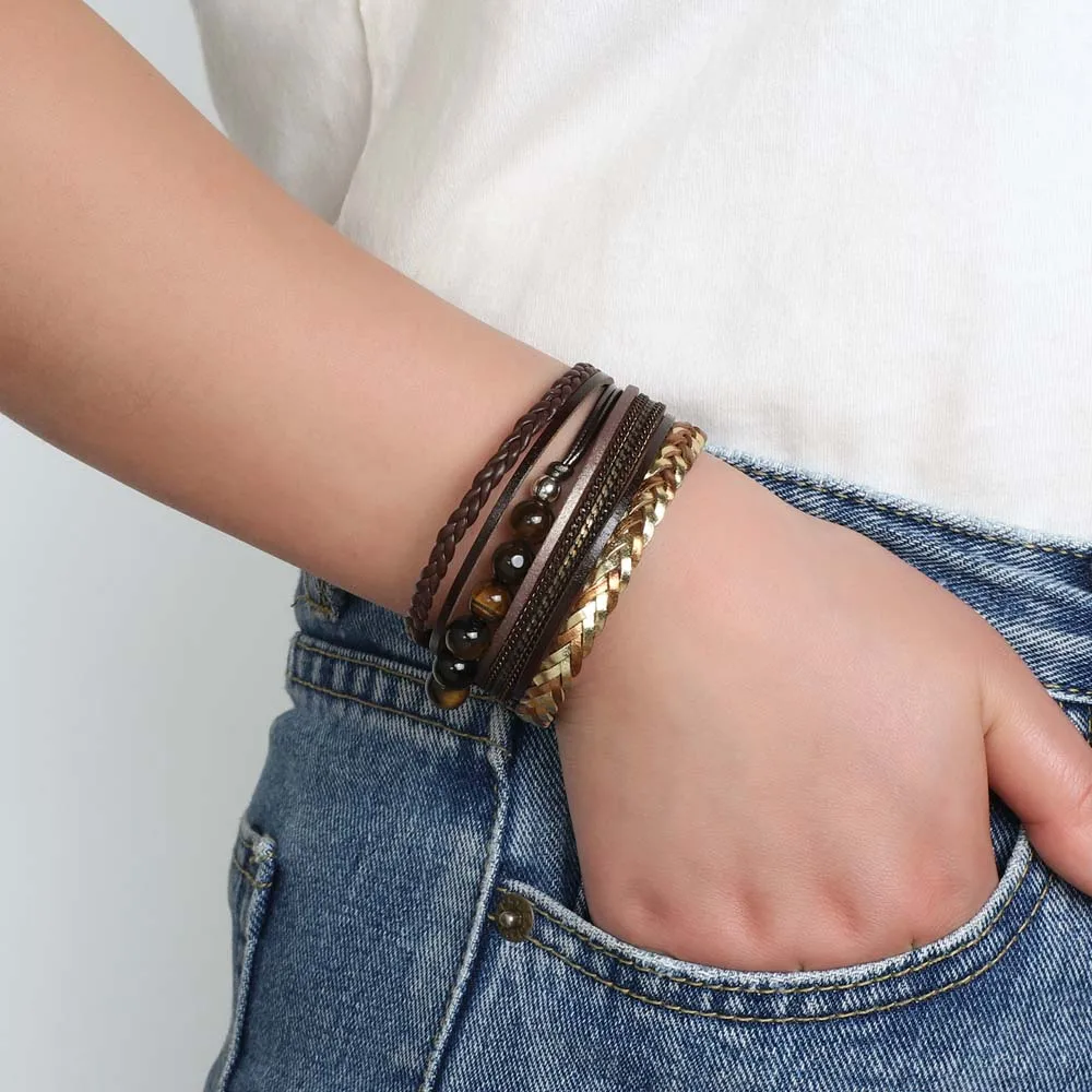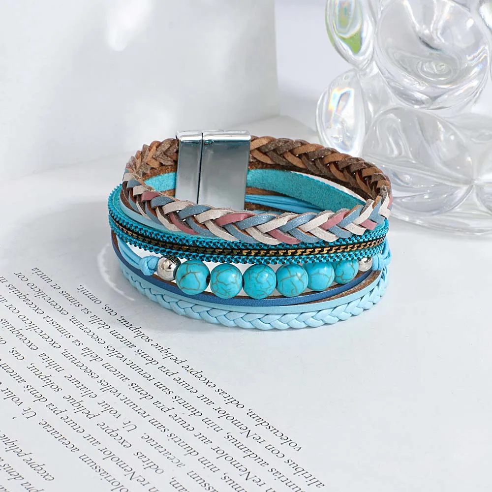 Женские кожаные браслеты Amorcome, синие очаровательные каменные бусины в стиле ретро с магнитной застежкой