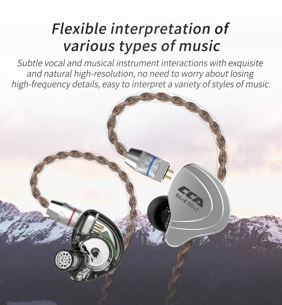 [4BA + 1DD обеспечивает высокое качество звука для всех пользователей] CCA C10 имеет четыре специально отрегулированных 30095 + 50060 сбалансированных арматурных драйвера для улучшения высокочастотной производительности, И двойной Магнитный Динамический драйвер 10 мм, чтобы сделать низкую частоту максимально низкой. Он также обеспечивает почти реальный опыт пения, певец поет за ушами.