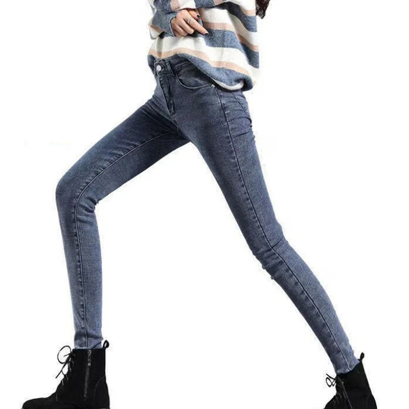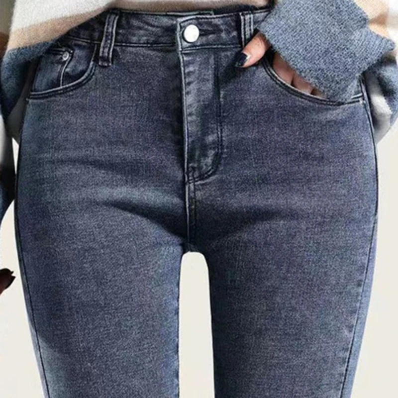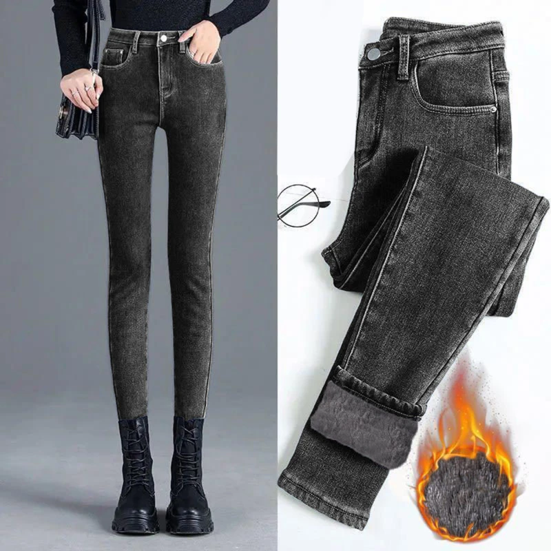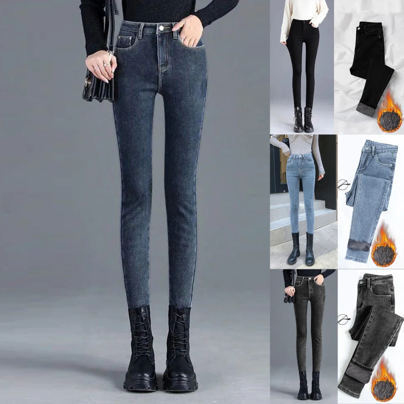 Утолщенные Эластичные Обтягивающие флисовые джинсы зимние женские черные