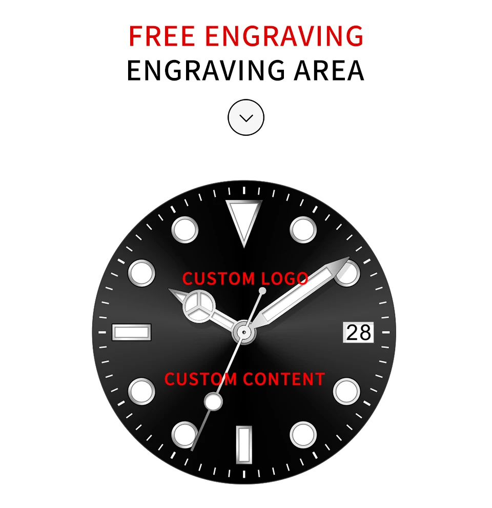 Индивидуальные области: логотип циферблата/текст, задняя крышка/логотип/текст, Корона/логотип/текст, Пряжка/текст.