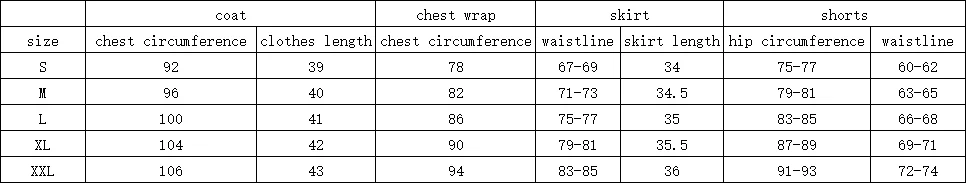 size | chestcircumference | clotheslength | chestcircumference | waistline | skirtlength | hipcircumference | waistline |
