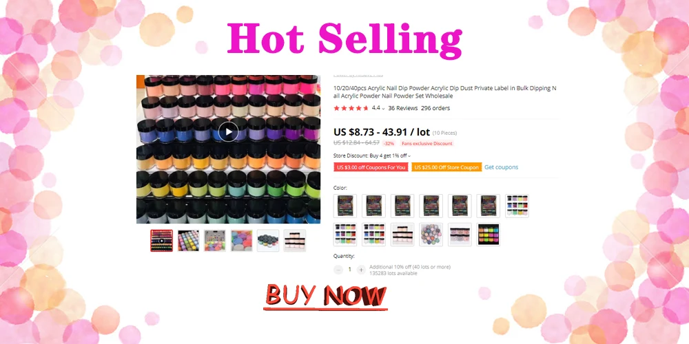 Магазин предлагает более 120 цветов пользовательских акриловых порошков и порошков, включая твердые цвета.