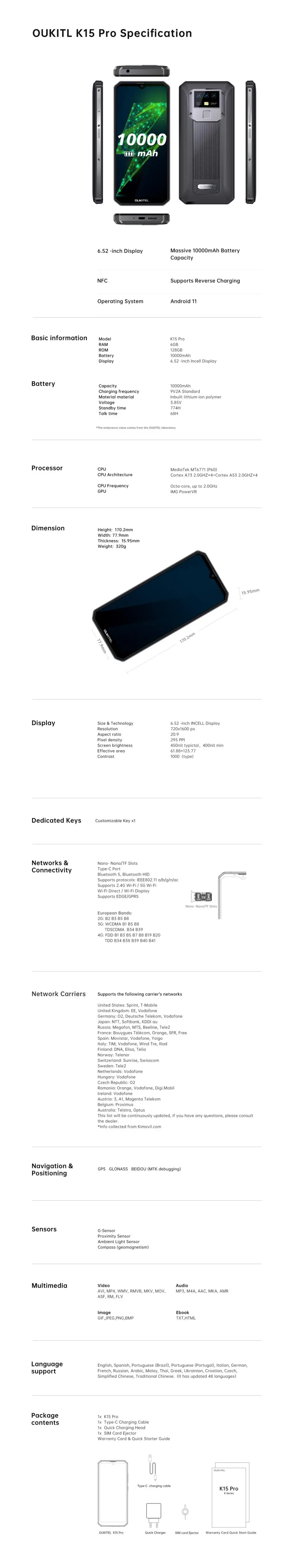 Сеть: Сеть 2G B2 B3 B5 B8 3G сеть WCDMA B1 B5 B8 TDSCDMA B34 B39 Сеть 4G FDD B1 B3 B5 B7 B8 B19 B20 TDD B34 B38 B39 B40 B41 | Посылка включает в себя: Зарядное устройство x1 Кабель типа C x1 Руководство пользователя x1 Штырь sim-карты x1 | |