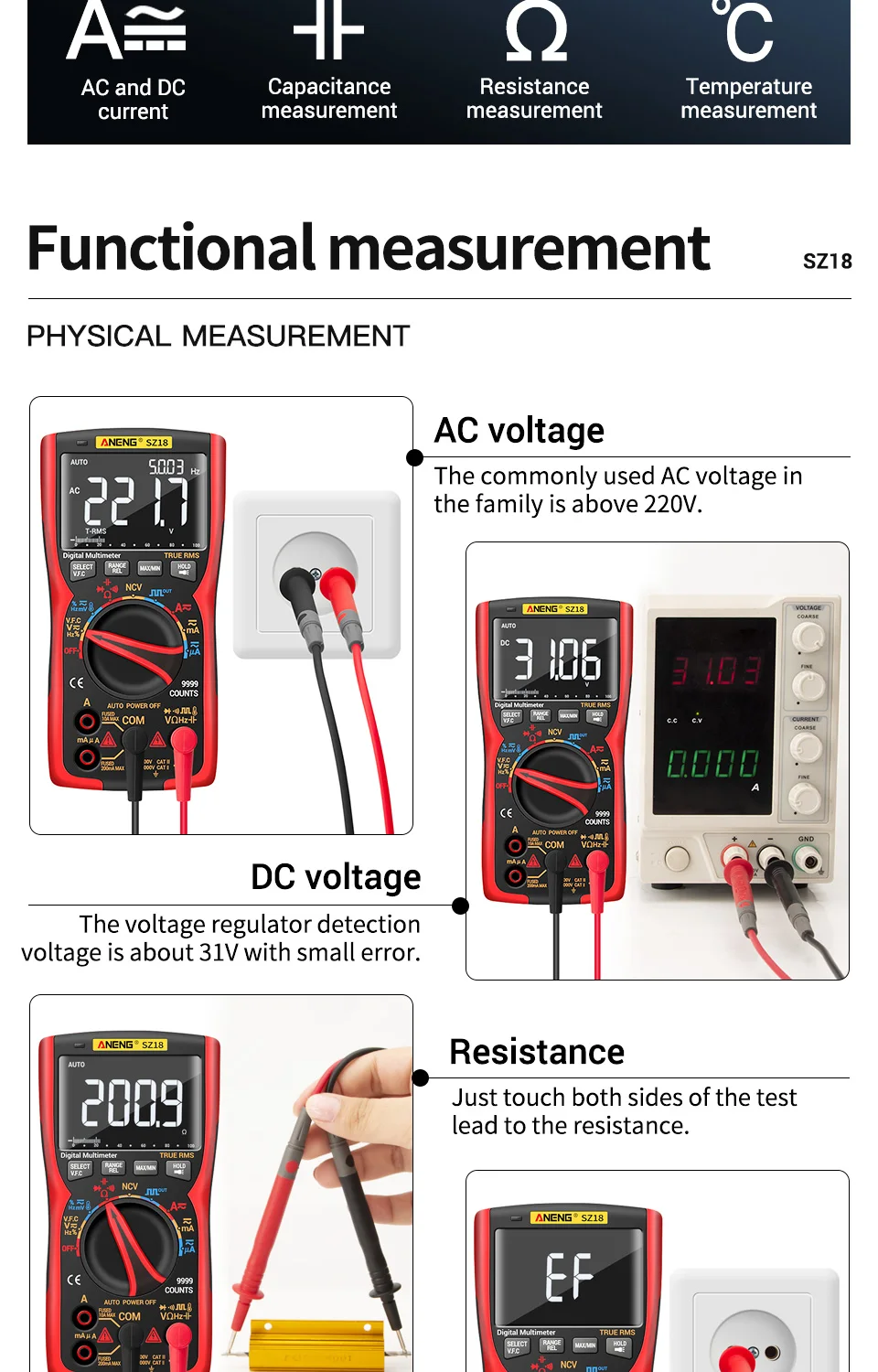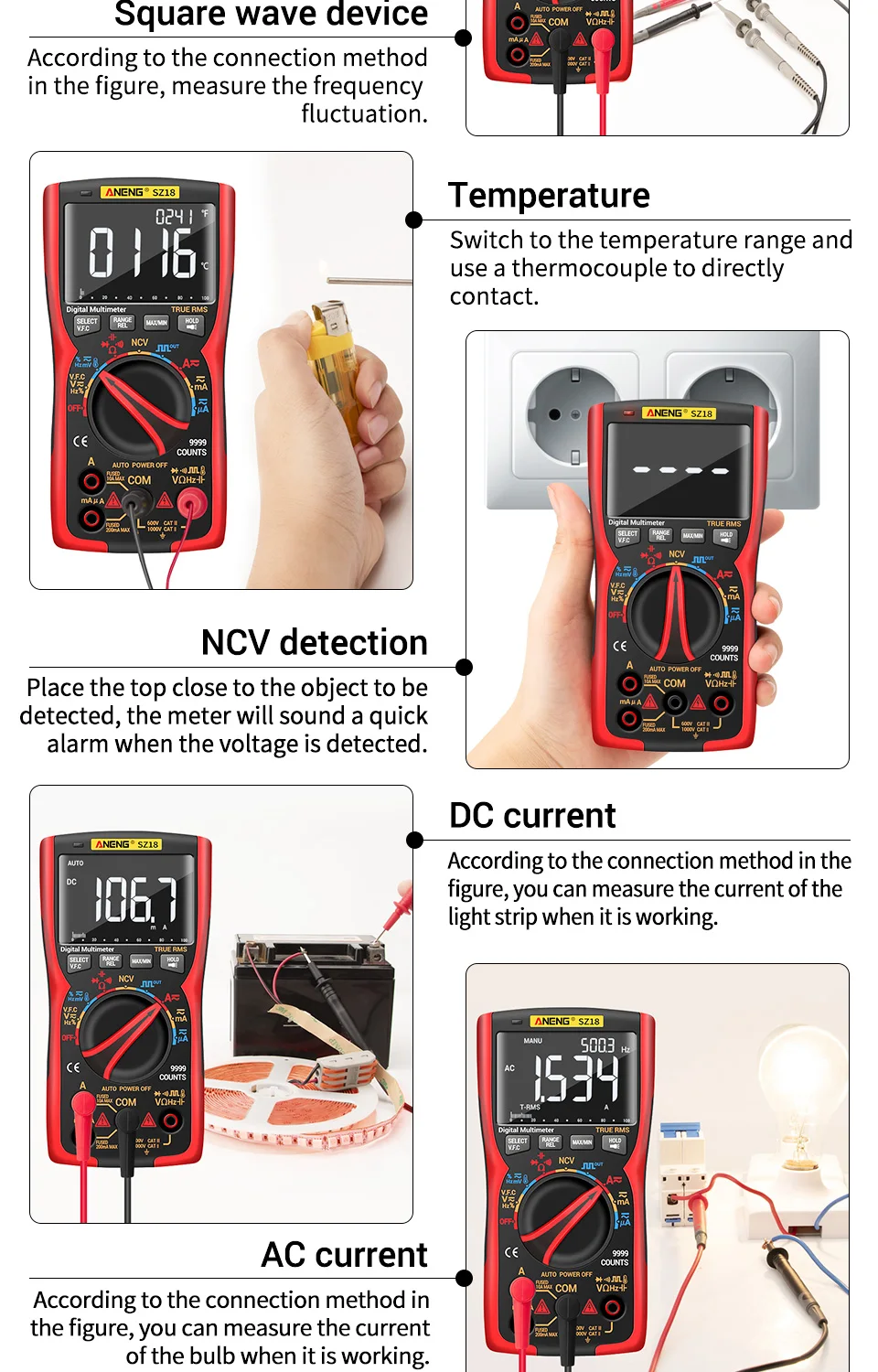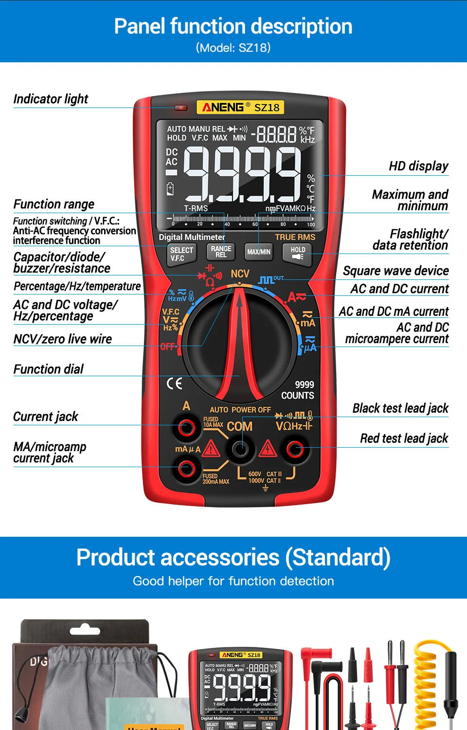 ANENG SZ18-это автоматический цифровой мультиметр диапазона с 9999 словами с истинным эффективным значением. Инструмент полностью работает с тройным дисплеем.