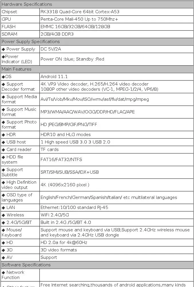 Brand NameGeartronicsOriginMainland ChinaCertificationNONEBluetooth4.0CPURK3318 Quad-CorOSANDROIDVideo OutputNoneMemory2G DDR3Memory4G DDR3Internal Storage16GB eMMCInternal Storage32GB eMMCInternal Storage64GB eMMCInternal Storage128GB eMMCWirelessYesEthernet100MMeasurement unit100000015Each pack1