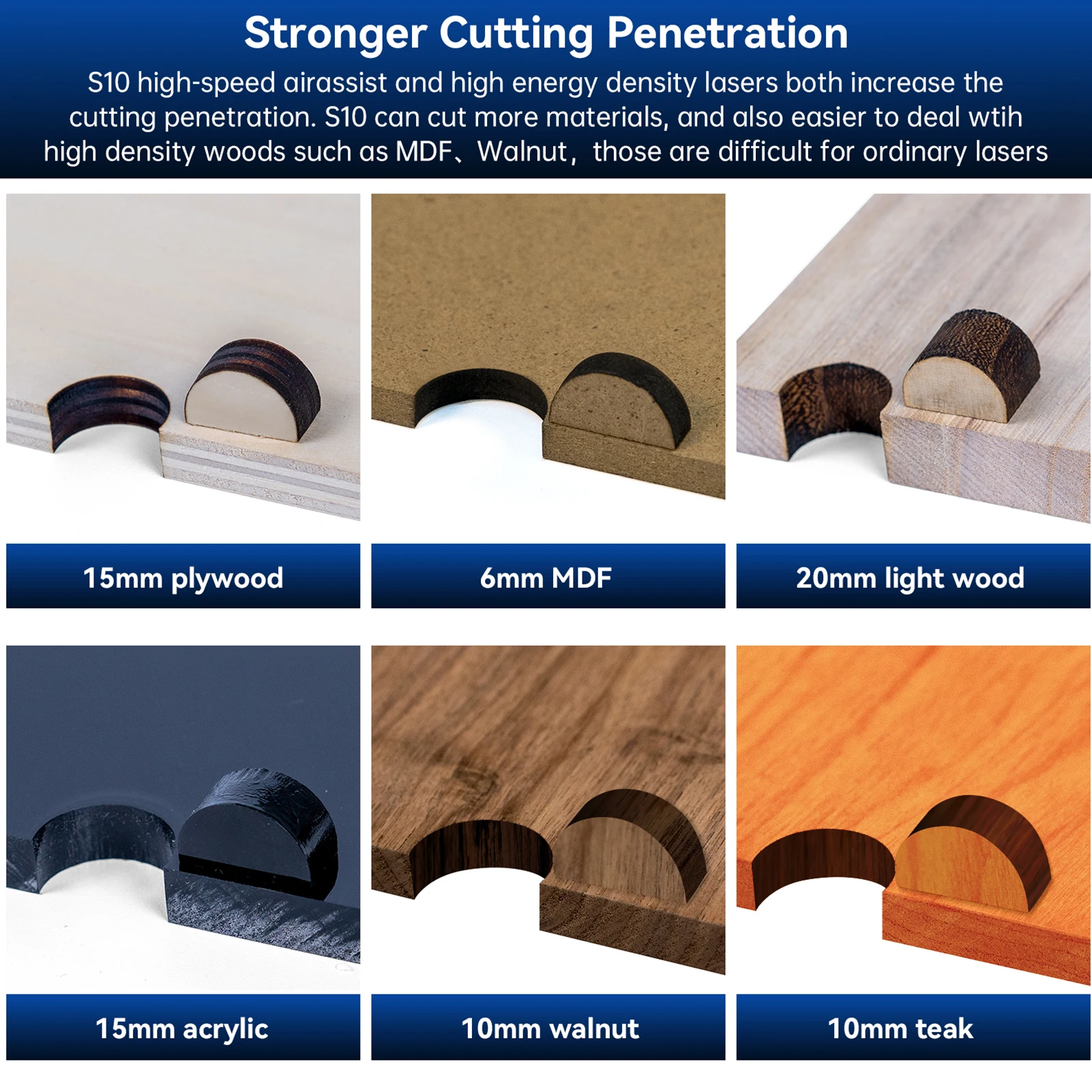 10 Вт технология формирования лазерного луча:Выходная мощность лазера S10 увеличена до 10 Вт, что в два раза больше, чем у S9. Но S10 получает один и тот же ультра-тонкий лазерный луч с 0,08 мм основное направление деятельности в S9, что означает, что S10 обладает более высокой плотности энергии, более резка проникновения и гравировка возможностей.