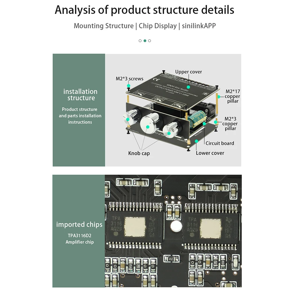 1. Original TPA3116D2 power amplifier chip: TPA3116D2 has AM interference suppression function; the output has a filter, HIFI sound quality, and the requirements for speakers are relatively low.