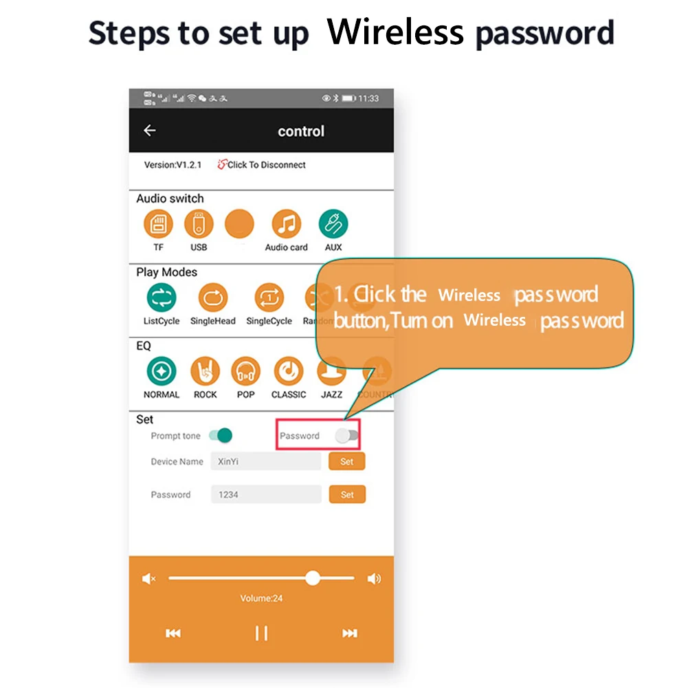 7. Support U disk playback: plug in the U disk, open the APP to switch the U disk mode, and with a prompt sound, enter the U disk playback mode