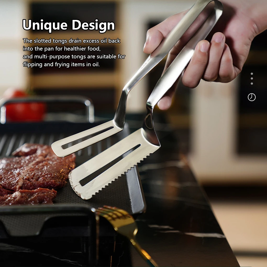 Уникальный дизайн: щелевые щипцы сливают излишки масла обратно в кастрюлю для более здоровой пищи, а многоцелевые щипцы подходят для переворачивания и жарки предметов в масле.