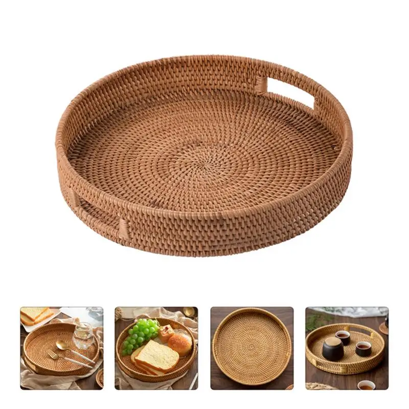 1Pc Vietnam Rattan Basket Tray Hand-Woven Storage Basket Bread Basket Living Room Fruit Plate Tea Tray Withe Handle