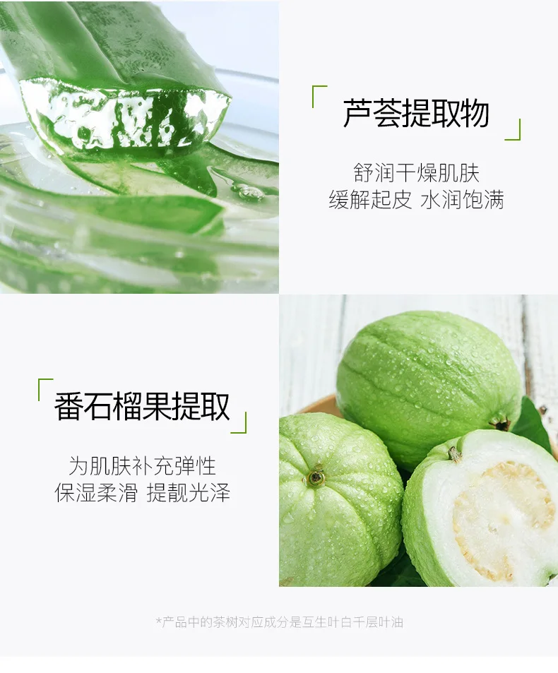 Эффективность: содержит масло листьев алтернаты мелалеуки, которое может облегчить сухость и шероховатость кожи, сделать кожу нежной, влажной, свежей и гладкой