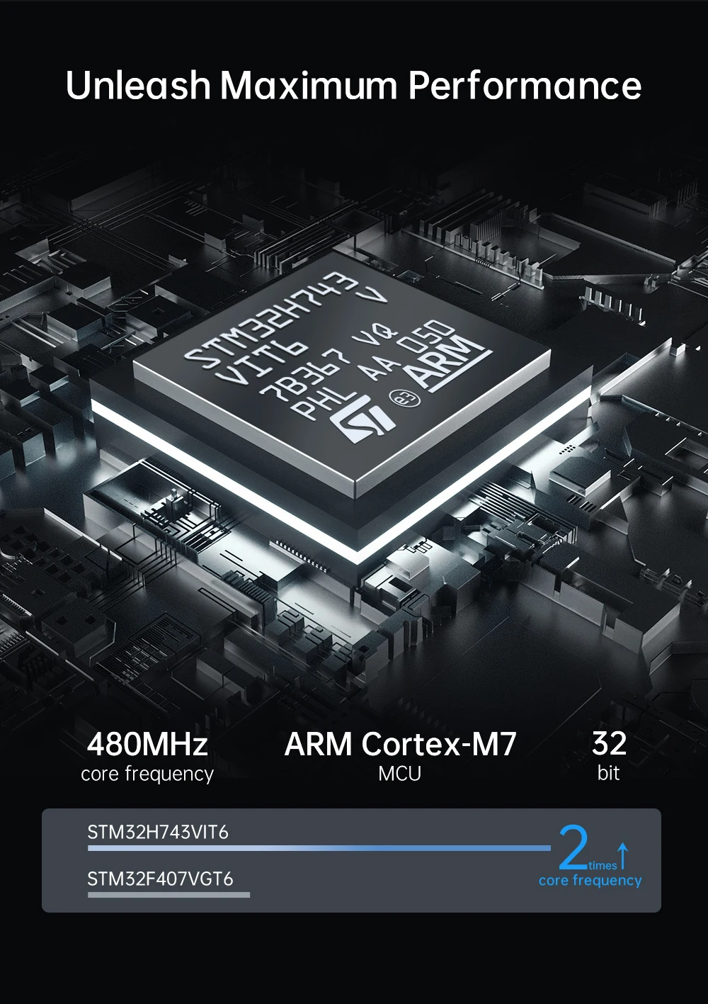 1. Используя 32-разрядный ARM Cortex-M7 серии STM32H743VI основной чип управления с основная частота 480 МГц, производительность значительно улучшен.