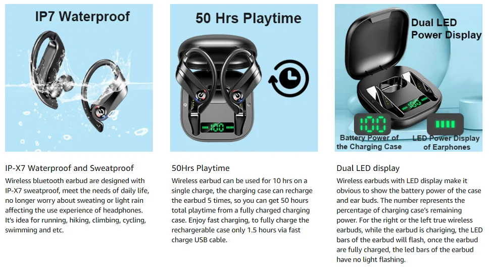 [50H время воспроизведения и двойной светодиодный дисплей питания]: беспроводной bluetooth-наушник с низким энергопотреблением, Одна зарядка дает вам полный 10 часов прослушивания. Так что вы можете получить около 50 часов, общее время непрерывного воспроизведения может достигать от полностью заряженного зарядный чехол, отличная мощность Емкость жесткого диска обеспечивая часов отличного прослушивания.